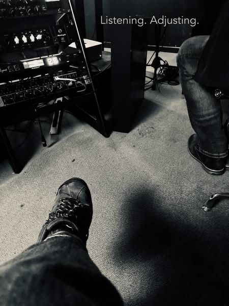 Mixage en cours. Quelques jours passés dans la salle, à travailler sur la nouvelle musique de 3'Ain. Écoute attentive. Réglages minutieux. La trompette, l'accordéon chromatique et la contrebasse trouvent leur place. À bientôt pour la suite.